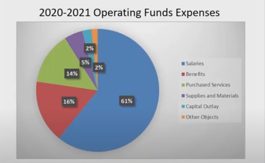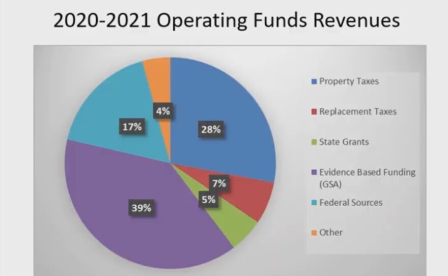 McKenzie noted that 77% of the operating expenses go toward salaries and benefits, while purchased services, supplies and materials account for another 19%. The evidence-based funding accounts for 39% of revenue, while 28% comes from property taxes and 17% from federal sources.